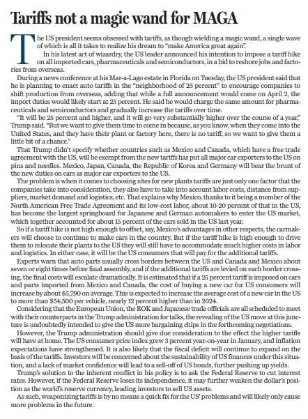 但是,特朗普政府也应该充分考虑高额关税将给其国内带来的影响。美国1月CPI同比增速升至3%,通胀预期不断加强。在加征关税的基础上,美国的财政赤字很可能将持续扩大。在这种情况下,投资者将对美国财政的可持续性产生担忧,而市场信心缺失会导致美债被抛售,从而进一步推高收益率。